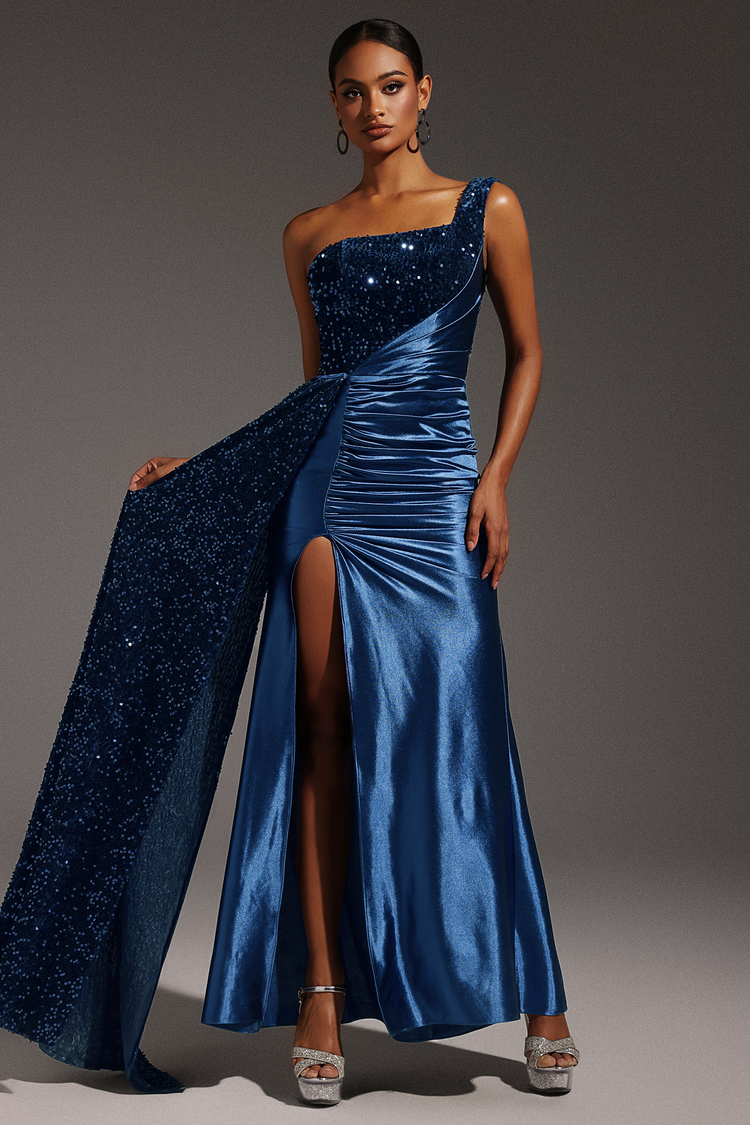 Kerla One Shoulder Sleeveless High Slit Velvet Sequin Maxi Dress