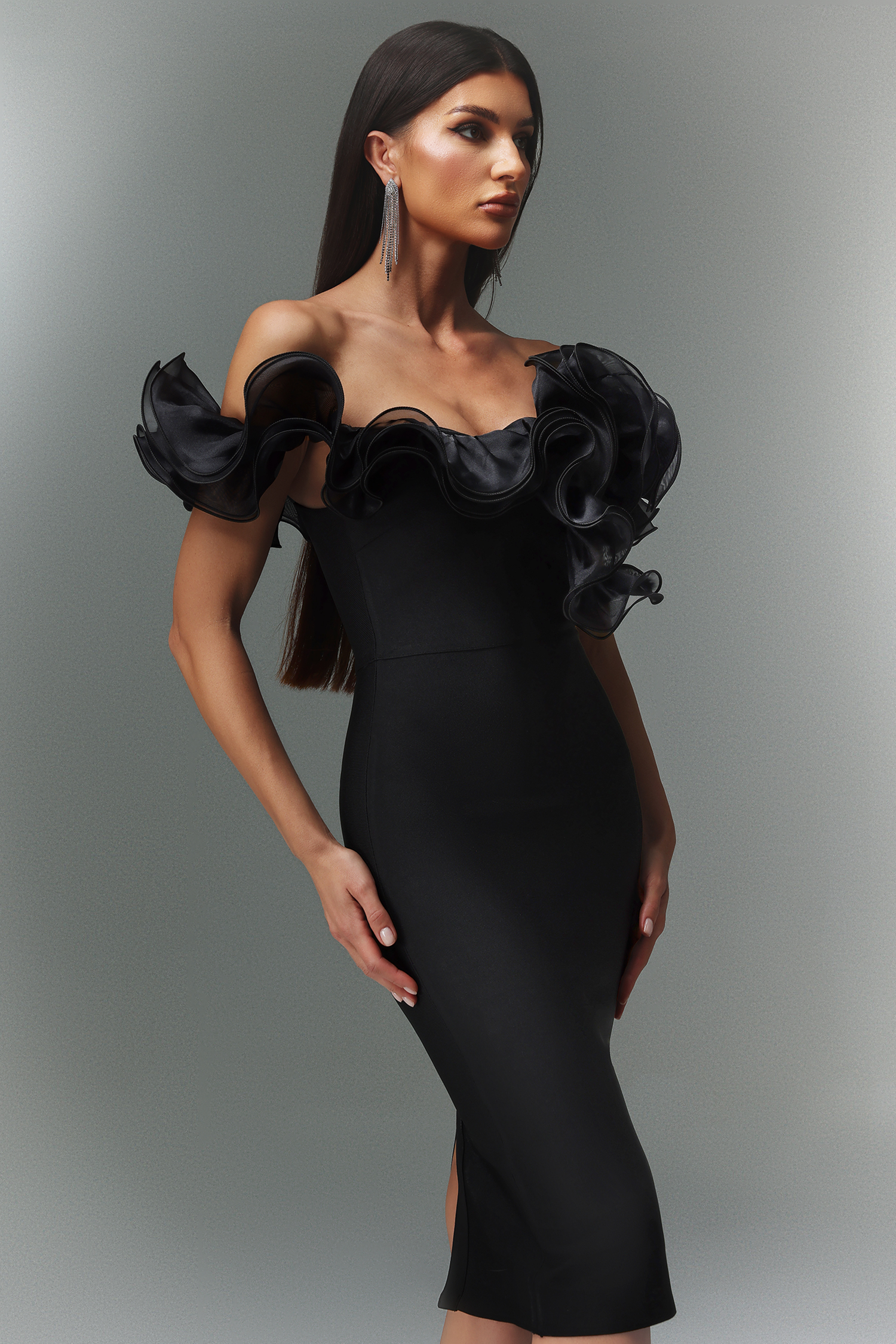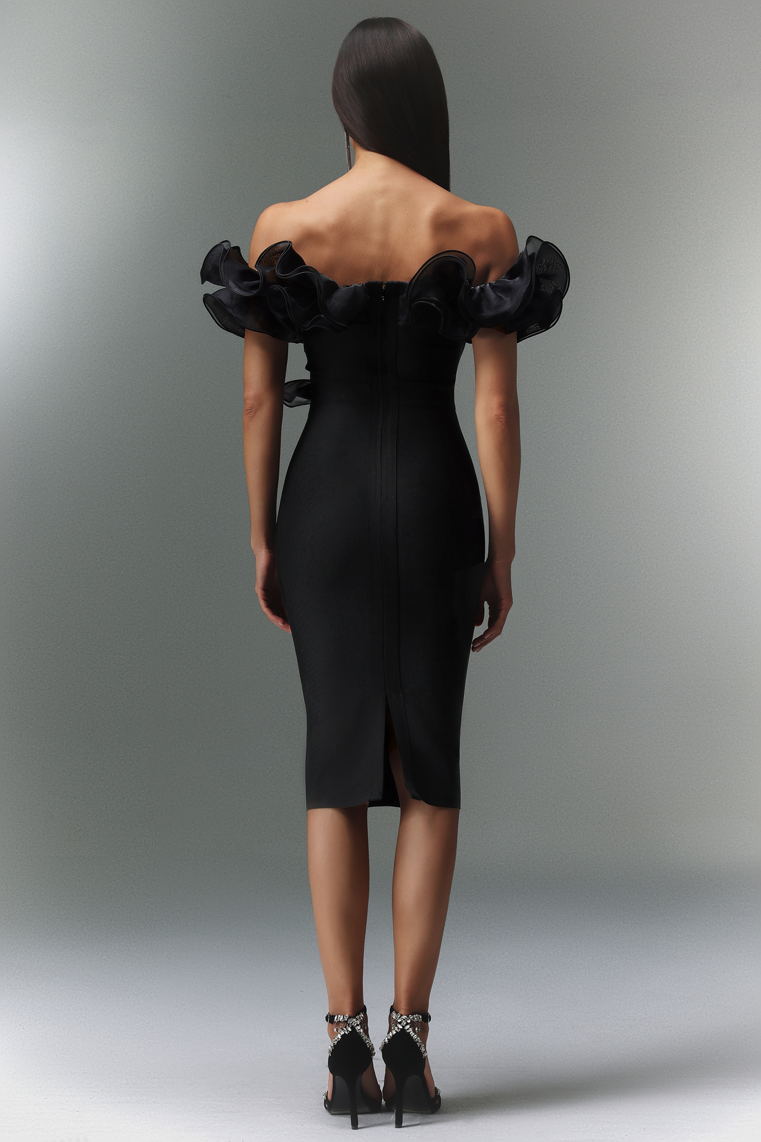 Leanna Off-The-Shoulder Flounce Bandage Midi Dress