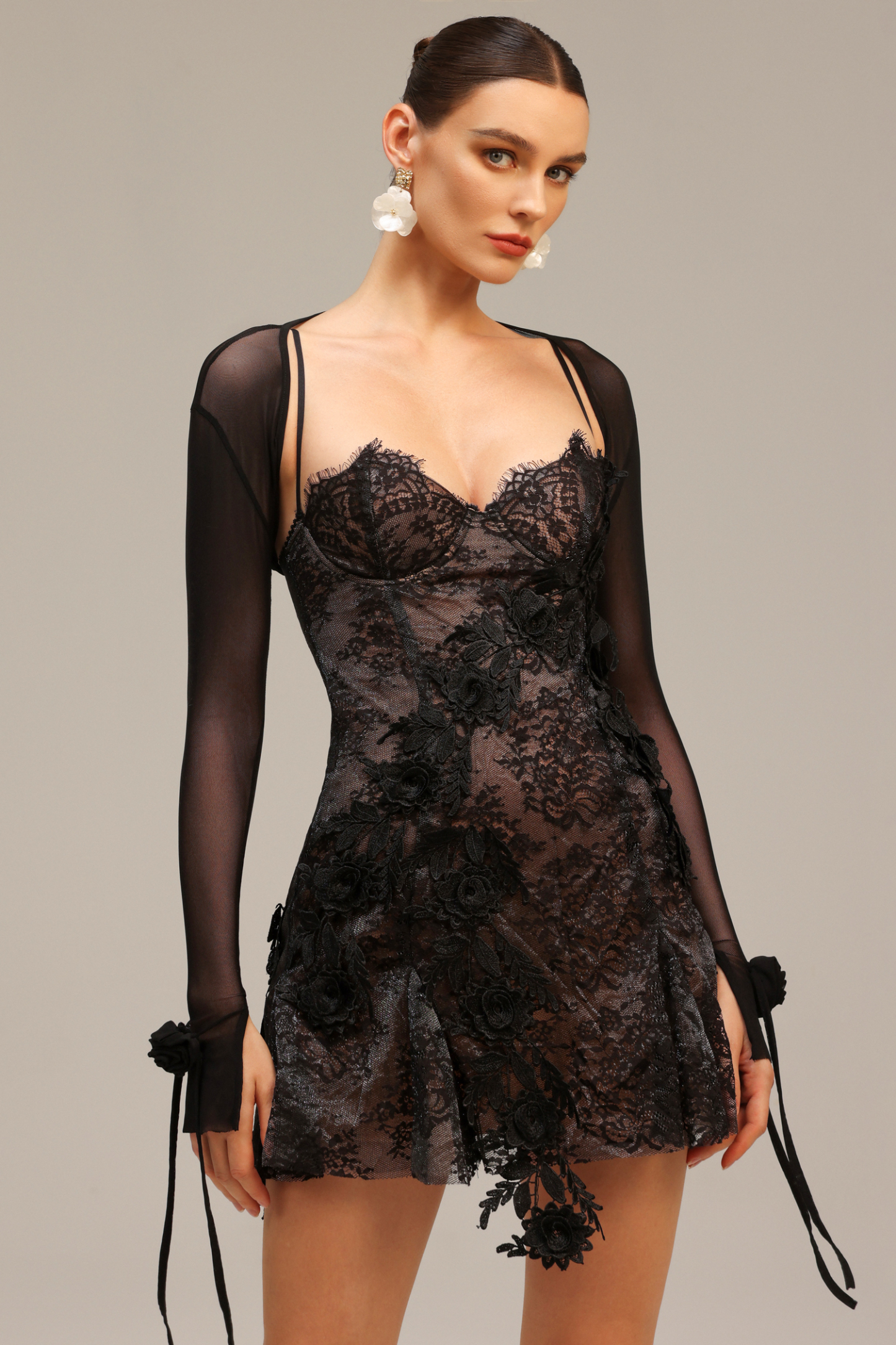 Sarna Halter Lace Flowers Mini Dress And Coat Two-Piece Set