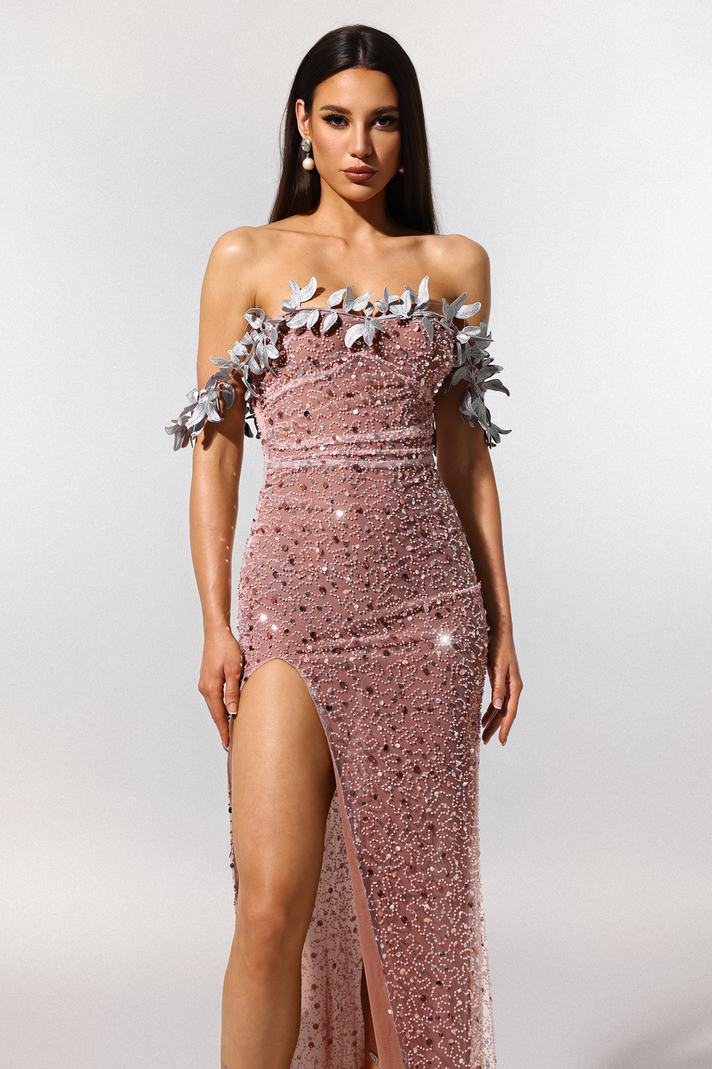 Siola Off-The-Shoulder Lace Slit Sequins Maxi Dress