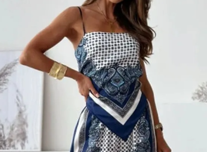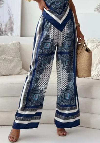 Women's Fashion Two-Piece Set: Printed Spaghetti Strap Bandeau Top + Allover-Print Trousers